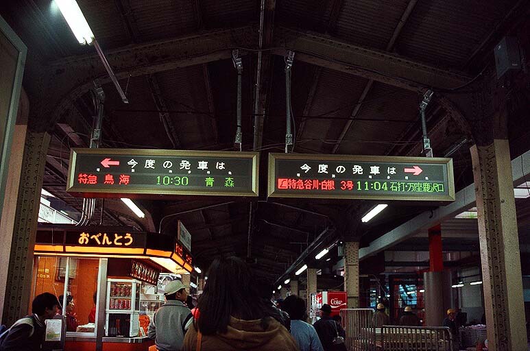 ■1985-3-10 上野 発車案内。5番線は「ゆけむり3号」「はるな1号」となっていて、上の写真の列車の案内表示です。小山行きが「はるな1号」で、新前橋で「ゆけむり3号」と分割して両毛線経由となります。大宮で分割するわけでありませんので念のため・・・。右側の115系(7番線)はよく見ると、ホームと反対側のドアを開けています。これは車体横に挿している行き先板の交換作業をしやすくするためです(交換をしない場合でも開けていましたが)
