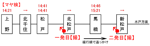 月曜日は14時に下校でき、順当なら北千住14:24着の電車(東武)に私は乗ってきたはずですが、北千住駅の構造上、14:25発の常磐緩行線には乗れません。その次の緩行線は12分後の14:37発となり、その間、マヤ検は14:31頃に北千住を通過してしまいますので、これでは話にならないのです。